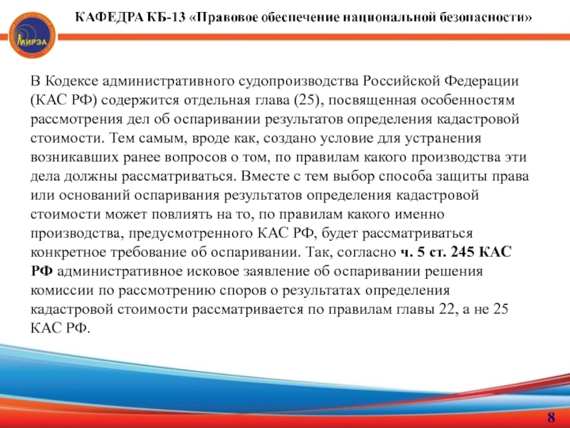 глава (25), посвященная особенностям рассмотрения дел об оспаривании результатов определения кадастровой стоимости. Тем самым, вроде как, создано условие для устранения возникавших ранее вопросов о том, по правилам какого производства эти дела должны рассматриваться. Вместе с тем выбор способа защиты права или оснований оспаривания результатов определения кадастровой стоимости может повлиять на то, по правилам какого именно производства, предусмотренного КАС РФ, будет рассматриваться конкретное требование об оспаривании. Так, согласно ч. 5 ст. 245 КАС РФ административное исковое заявление об оспаривании решения комиссии по рассмотрению споров о результатах определения кадастровой стоимости рассматривается по правилам главы 22, а не 25 КАС РФ.
