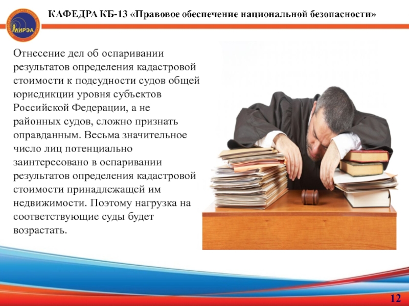 судов общей юрисдикции уровня субъектов Российской Федерации, а не районных судов, сложно признать оправданным. Весьма значительное число лиц потенциально заинтересовано в оспаривании результатов определения кадастровой стоимости принадлежащей им недвижимости. Поэтому нагрузка на соответствующие суды будет возрастать.