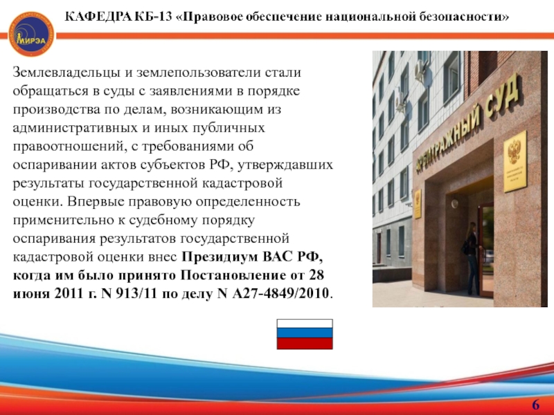 порядке производства по делам, возникающим из административных и иных публичных правоотношений, с требованиями об оспаривании актов субъектов РФ, утверждавших результаты государственной кадастровой оценки. Впервые правовую определенность применительно к судебному порядку оспаривания результатов государственной кадастровой оценки внес Президиум ВАС РФ, когда им было принято Постановление от 28 июня 2011 г. N 913/11 по делу N А27-4849/2010.
