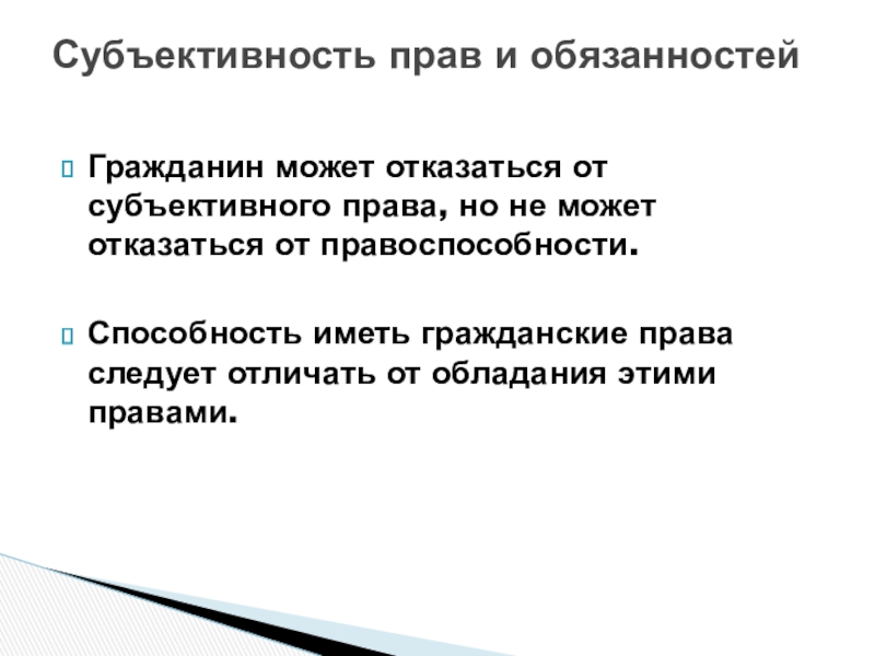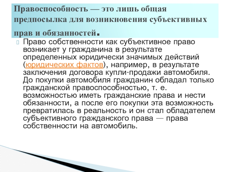 Правоспособность — это лишь общая предпосылка для возникновения субъективных прав и обязанностей.