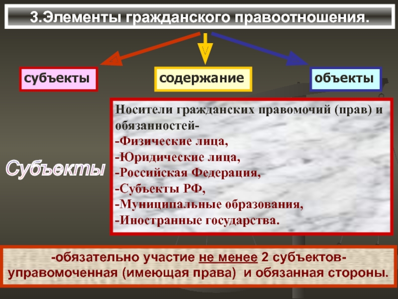 -оно представляет собой связь между участниками гражданского правового отношения, в силу которой они выступают в качестве обладателей субъективных гражданских прав.