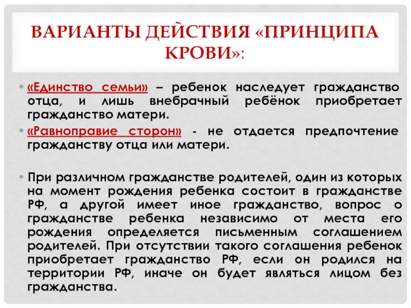 «Равноправие сторон» - не отдается предпочтение гражданству отца или матери.
