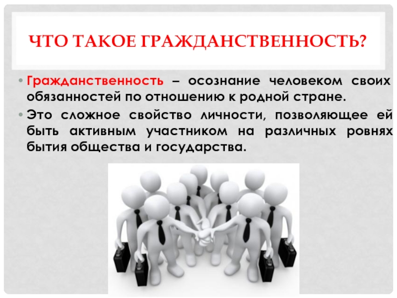 Это сложное свойство личности, позволяющее ей быть активным участником на различных ровнях бытия общества и государства.