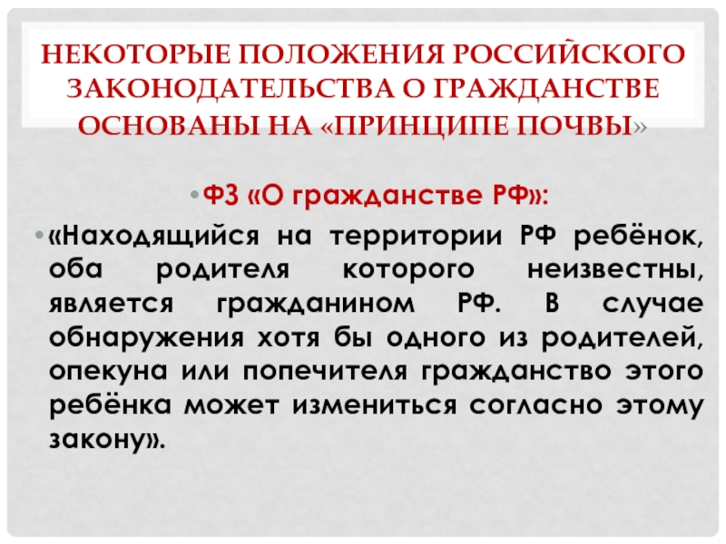Слайд 12Некоторые положения российского законодательства о гражданстве основаны на «принципе почвы»