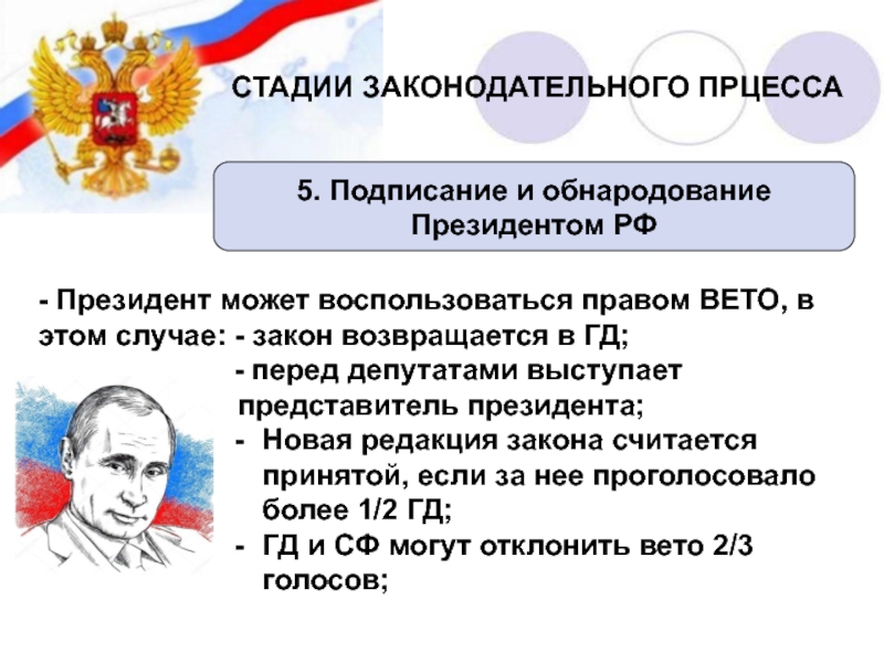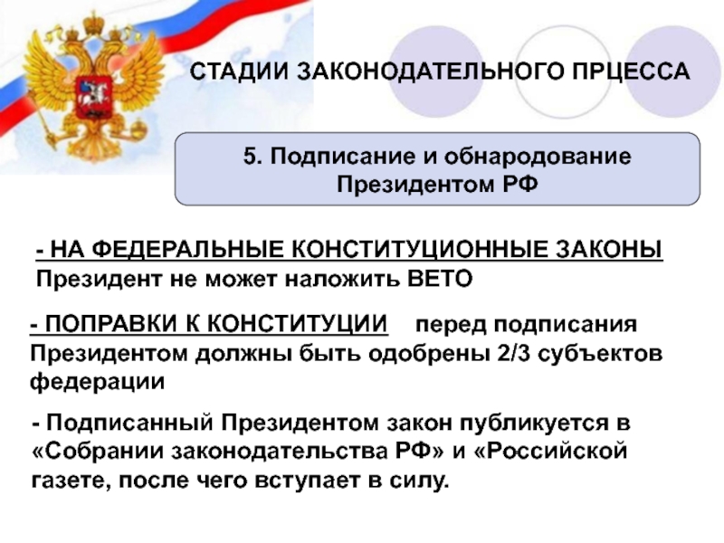 - Подписанный Президентом закон публикуется в «Собрании законодательства РФ» и «Российской газете, после чего вступает в силу.