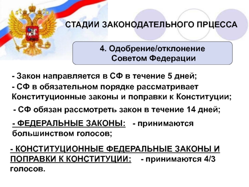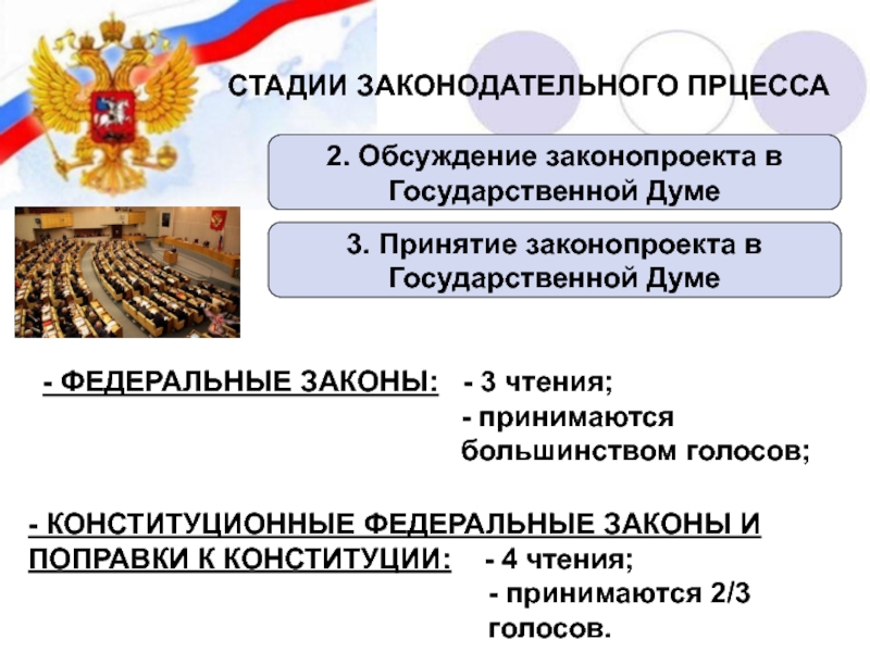 - КОНСТИТУЦИОННЫЕ ФЕДЕРАЛЬНЫЕ ЗАКОНЫ И ПОПРАВКИ К КОНСТИТУЦИИ: - принимаются 4/3 голосов.