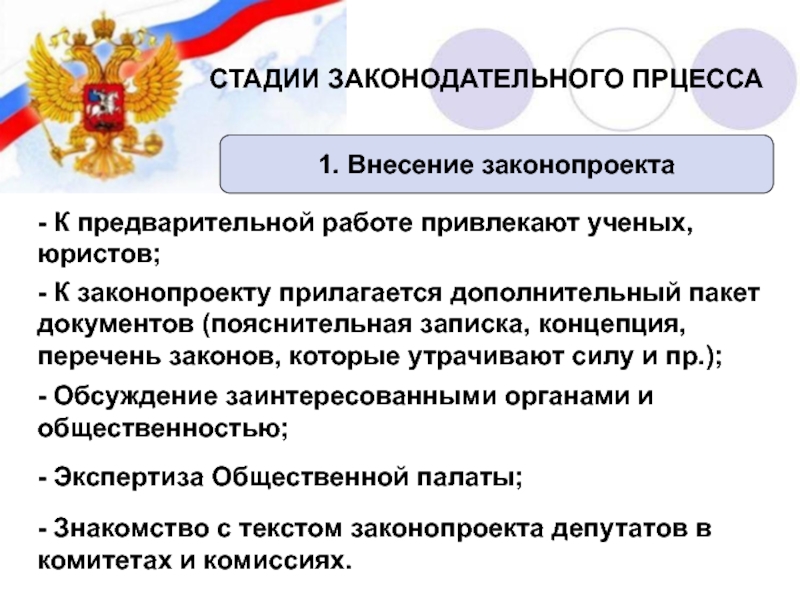 - Знакомство с текстом законопроекта депутатов в комитетах и комиссиях.
