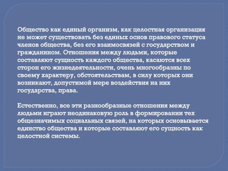 единых основ правового статуса членов общества, без его взаимосвязей с государством и гражданином. Отношения между людьми, которые составляют сущность каждого общества, касаются всех сторон его жизнедеятельности, очень многообразны по своему характеру, обстоятельствам, в силу которых они возникают, допустимой мере воздействия на них государства, права.