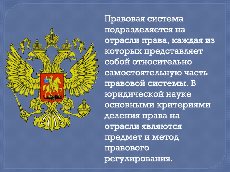 относительно самостоятельную часть правовой системы. В юридической науке основными критериями деления права на отрасли являются предмет и метод правового регулирования.
