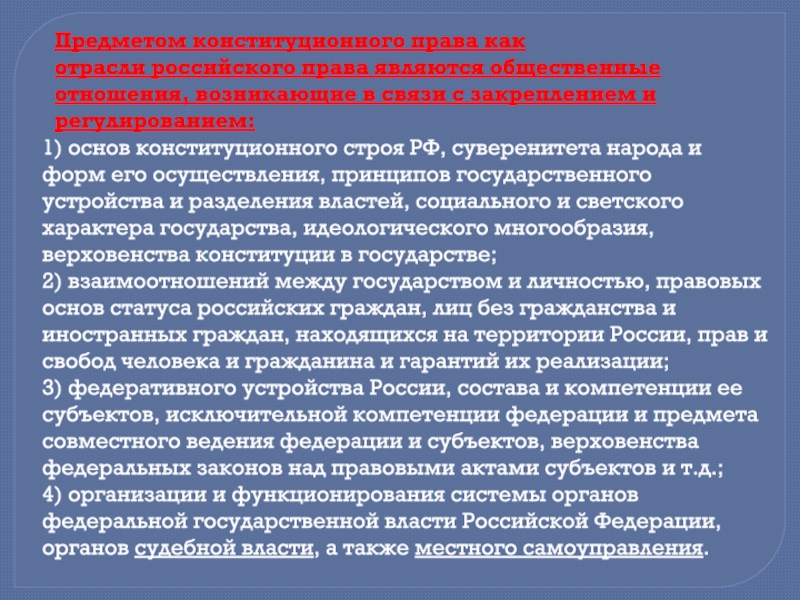 Слайд 4Предметом конституционного права как отрасли российского права являются общественные отношения, возникающие в связи