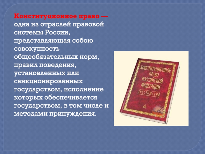 Слайд 2Конституционное право — одна из отраслей правовой системы России, представляющая собою