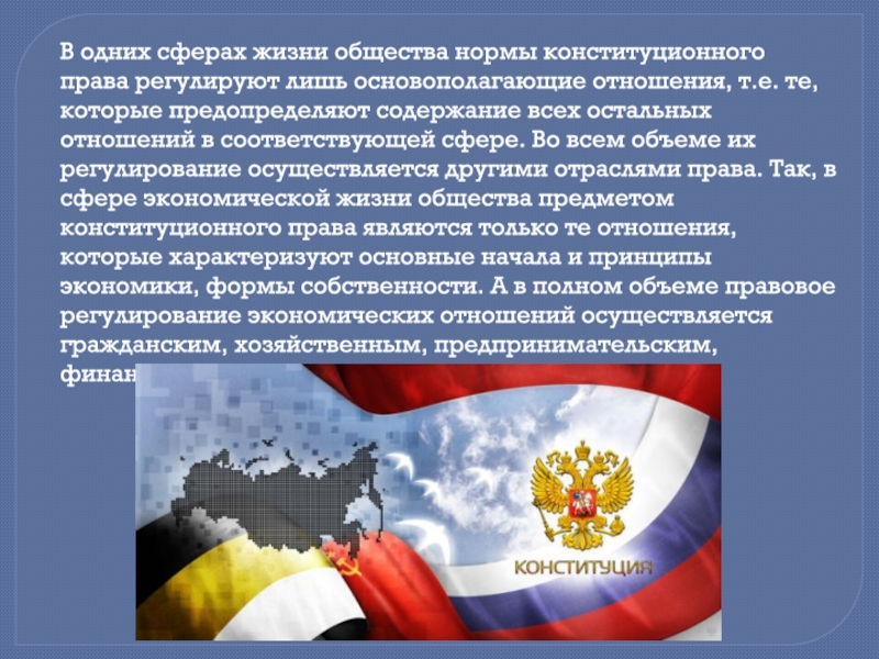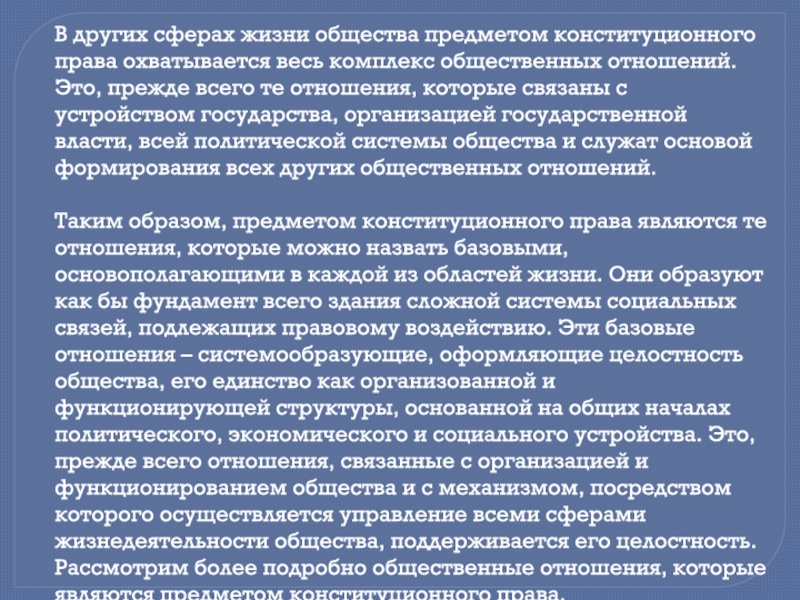 Слайд 8В других сферах жизни общества предметом конституционного права охватывается весь комплекс