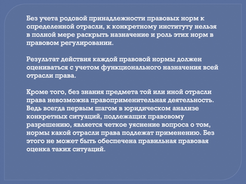 Кроме того, без знания предмета той или иной отрасли права невозможна правоприменительная деятельность. Ведь всегда первым шагом в юридическом анализе конкретных ситуаций, подлежащих правовому разрешению, является четкое уяснение вопроса о том, нормы какой отрасли права подлежат применению. Без этого не может быть обеспечена правильная правовая оценка таких ситуаций.