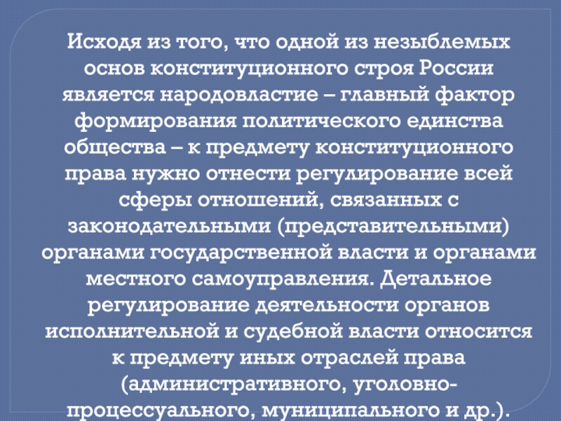 является народовластие – главный фактор формирования политического единства общества – к предмету конституционного права нужно отнести регулирование всей сферы отношений, связанных с законодательными (представительными) органами государственной власти и органами местного самоуправления. Детальное регулирование деятельности органов исполнительной и судебной власти относится к предмету иных отраслей права (административного, уголовно-процессуального, муниципального и др.).