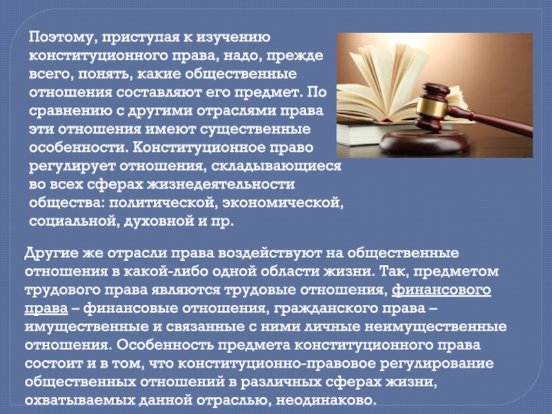 Поэтому, приступая к изучению конституционного права, надо, прежде всего, понять, какие общественные отношения составляют его предмет. По сравнению с другими отраслями права эти отношения имеют существенные особенности. Конституционное право регулирует отношения, складывающиеся во всех сферах жизнедеятельности общества: политической, экономической, социальной, духовной и пр.
