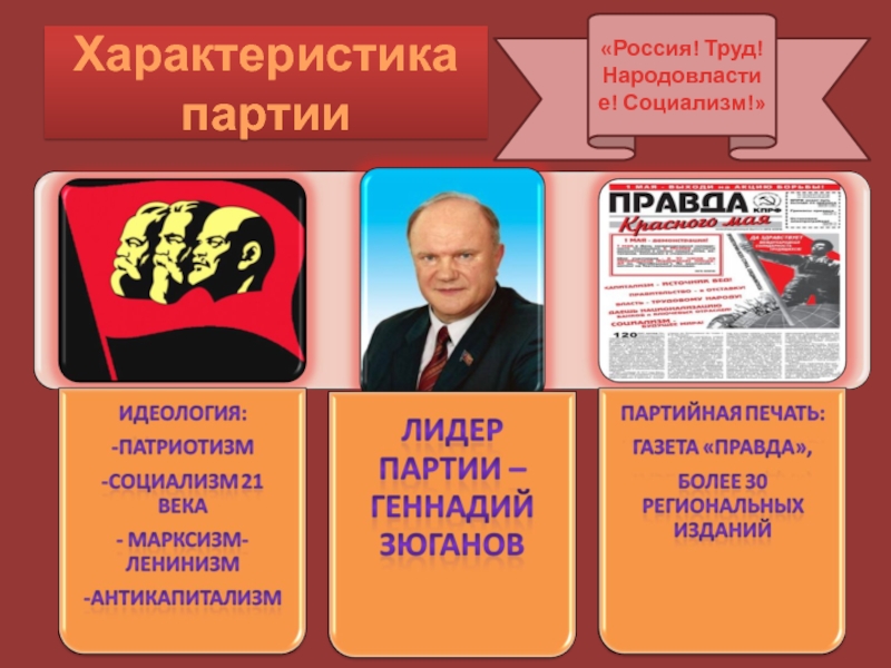 Характеристика партии«Россия! Труд! Народовластие! Социализм!»