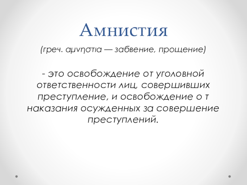 Амнистия(греч. αμνηστια — забвение, прощение)- это освобождение от уголовной ответственности лиц, совершивших преступление, и освобождение о т