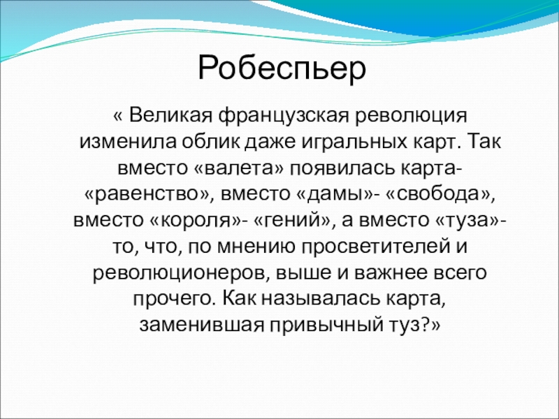 «валета» появилась карта- «равенство», вместо «дамы»- «свобода», вместо «короля»- «гений», а вместо «туза»-то, что, по мнению просветителей и революционеров, выше и важнее всего прочего. Как называлась карта, заменившая привычный туз?»