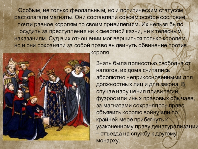 Особым, не только феодальным, но и политическим статусом располагали магнаты. Они составляли совсем особое сословие, почти равное королям по своим привилегиям. Их нельзя было осудить за преступления ни к смертной казни, ни к телесным наказаниям. Суд в их отношении мог вершиться только королем, но и они сохраняли за собой право выдвинуть обвинение против короля.