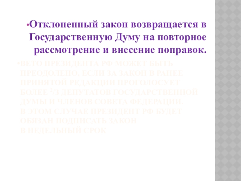 Отклоненный закон возвращается в Государственную Думу на повторное рассмотрение и внесение поправок.