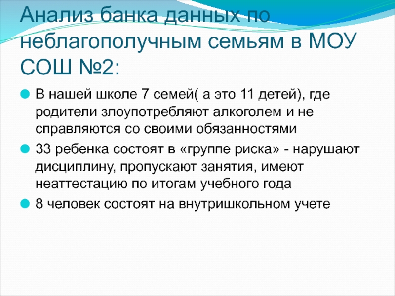 Слайд 14Анализ банка данных по неблагополучным семьям в МОУ СОШ №2: