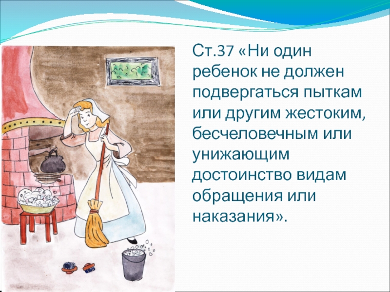 Слайд 27Ст.37 «Ни один ребенок не должен подвергаться пыткам или другим жестоким,