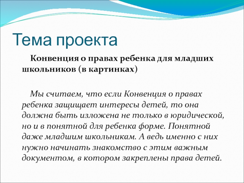 Мы считаем, что если Конвенция о правах ребенка защищает интересы детей, то она должна быть изложена не только в юридической, но и в понятной для ребенка форме. Понятной даже младшим школьникам. А ведь именно с них нужно начинать знакомство с этим важным документом, в котором закреплены права детей.