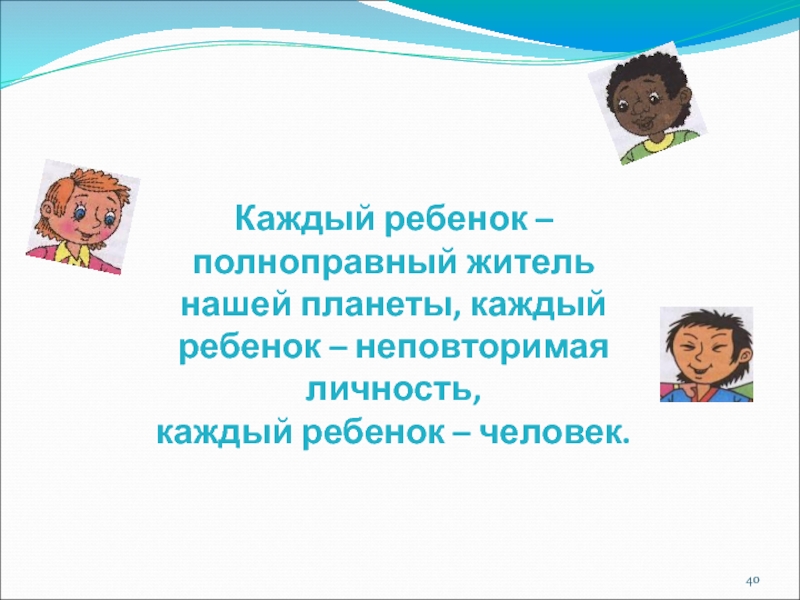 Слайд 40Каждый ребенок – полноправный житель нашей планеты, каждый ребенок – неповторимая