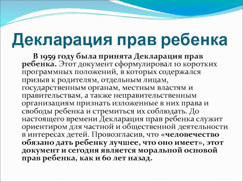 принята Декларация прав ребенка. Этот документ сформулировал 10 коротких программных положений, в которых содержался призыв к родителям, отдельным лицам, государственным органам, местным властям и правительствам, а также неправительственным организациям признать изложенные в них права и свободы ребенка и стремиться их соблюдать. До настоящего времени Декларация прав ребенка служит ориентиром для частной и общественной деятельности в интересах детей. Провозгласив, что «человечество обязано дать ребенку лучшее, что оно имеет», этот документ и сегодня является моральной основой прав ребенка, как и 60 лет назад.