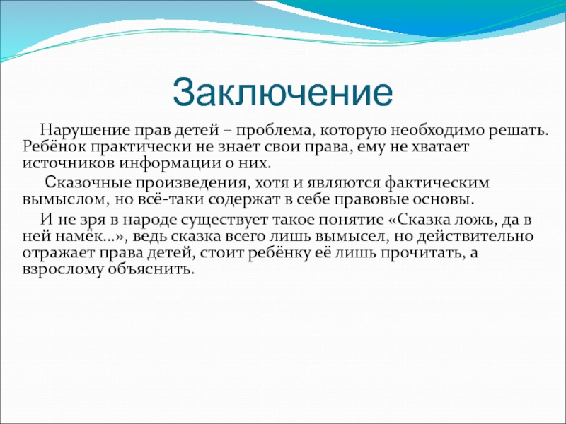 И не зря в народе существует такое понятие «Сказка ложь, да в ней намёк…», ведь сказка всего лишь вымысел, но действительно отражает права детей, стоит ребёнку её лишь прочитать, а взрослому объяснить.
