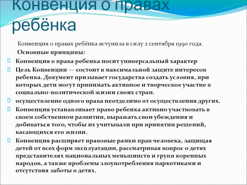 Конвенция расширяет правовые рамки прав человека, защищая детей от всех форм эксплуатации, рассматривая вопрос о детях представителях национальных меньшинств и групп коренных народов, а также проблемы злоупотребления наркотиками и отсутствия заботы о детях.