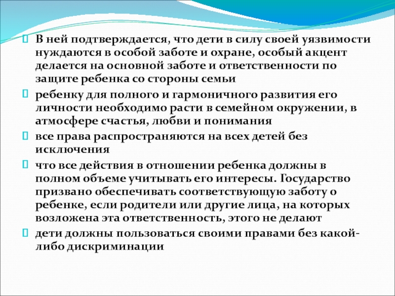 Слайд 17В ней подтверждается, что дети в силу своей уязвимости нуждаются в