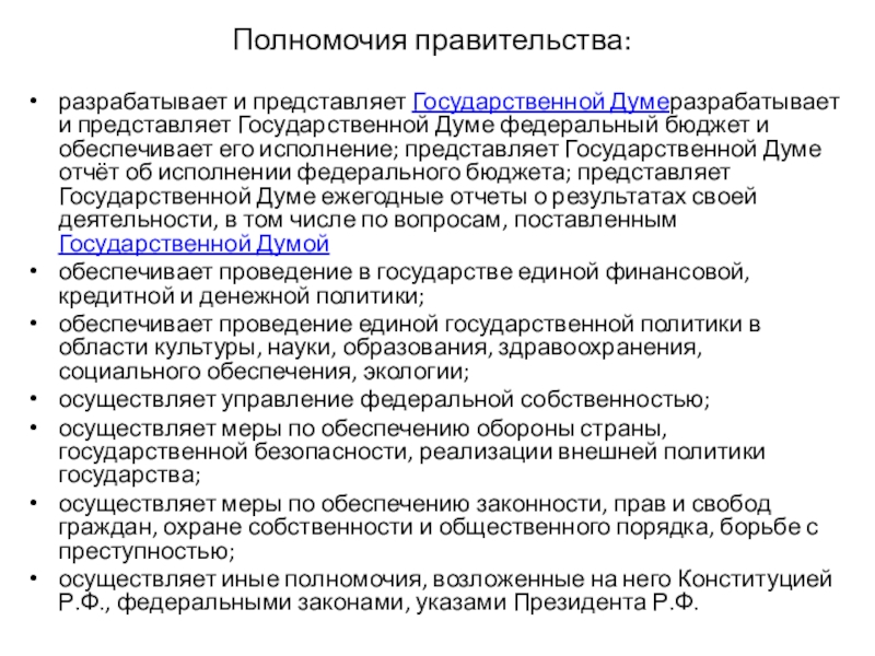 бюджет и обеспечивает его исполнение; представляет Государственной Думе отчёт об исполнении федерального бюджета; представляет Государственной Думе ежегодные отчеты о результатах своей деятельности, в том числе по вопросам, поставленным Государственной Думой