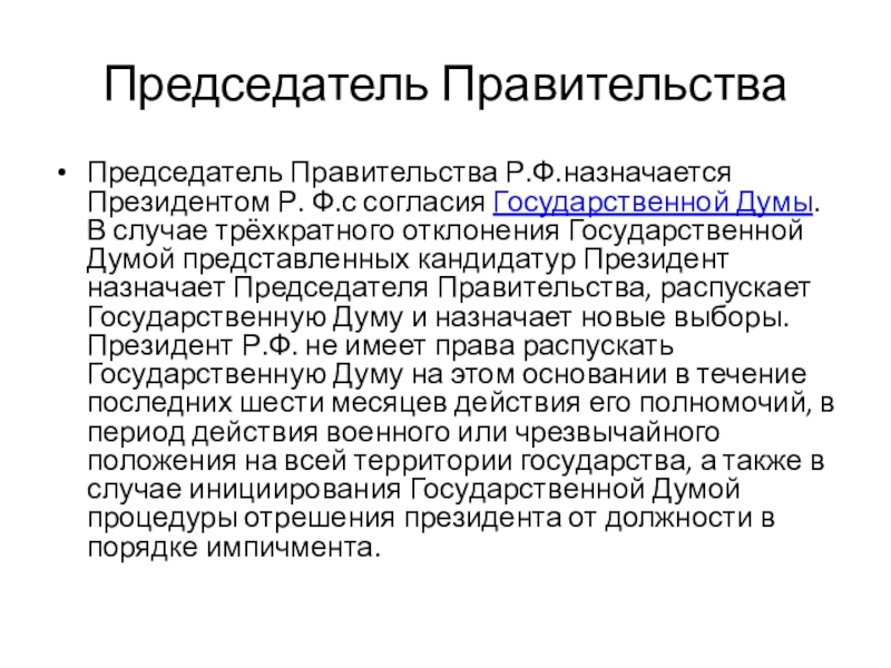 случае трёхкратного отклонения Государственной Думой представленных кандидатур Президент назначает Председателя Правительства, распускает Государственную Думу и назначает новые выборы. Президент Р.Ф. не имеет права распускать Государственную Думу на этом основании в течение последних шести месяцев действия его полномочий, в период действия военного или чрезвычайного положения на всей территории государства, а также в случае инициирования Государственной Думой процедуры отрешения президента от должности в порядке импичмента.