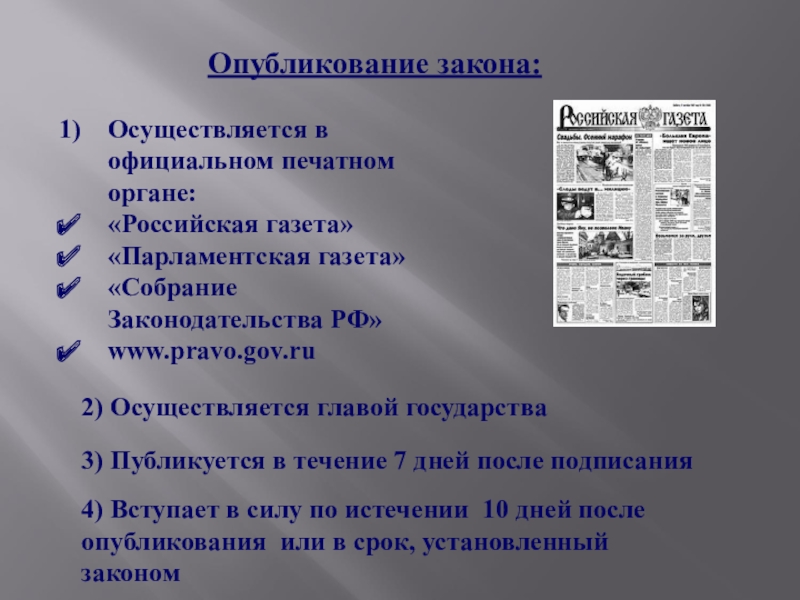4) Вступает в силу по истечении 10 дней после опубликования или в срок, установленный законом