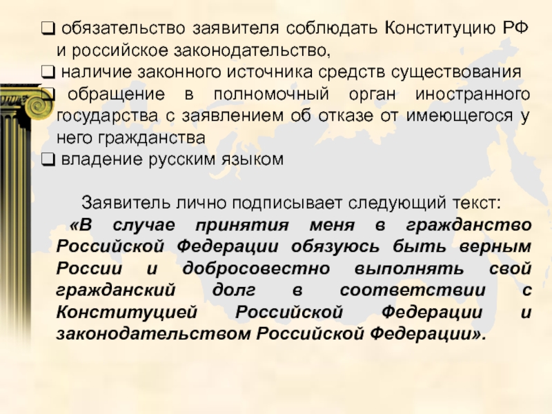Слайд 20 обязательство заявителя соблюдать Конституцию РФ и российское законодательство,