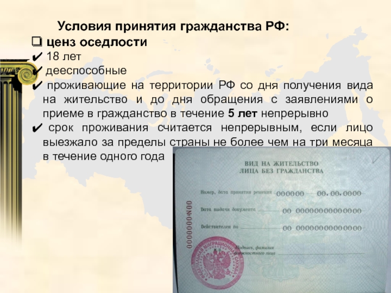 Слайд 18 Условия принятия гражданства РФ: