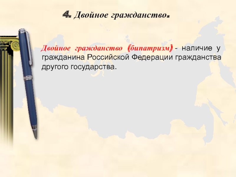 Слайд 28Двойное гражданство (бипатризм) - наличие у гражданина Российской Федерации гражданства другого государства.