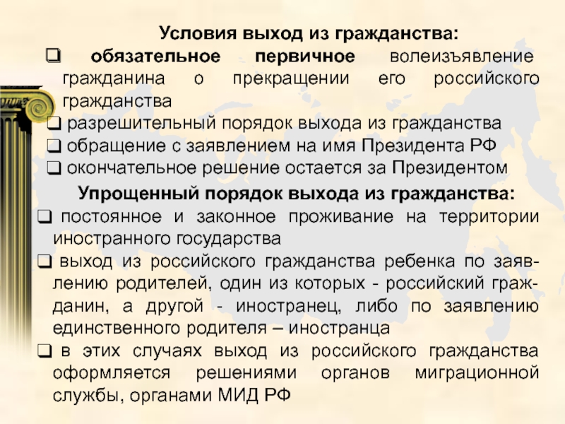 Слайд 35 Условия выход из гражданства: