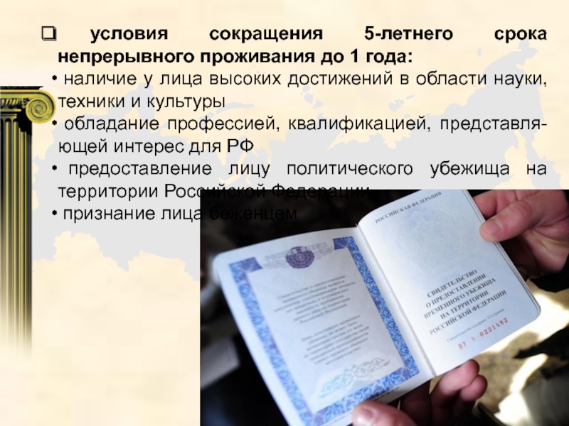 Слайд 19 условия сокращения 5-летнего срока непрерывного проживания до 1 года: