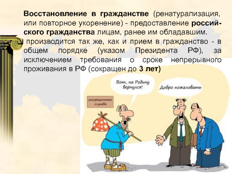 Слайд 24Восстановление в гражданстве (ренатурализация, или повторное укоренение) - предоставление россий-ского гражданства