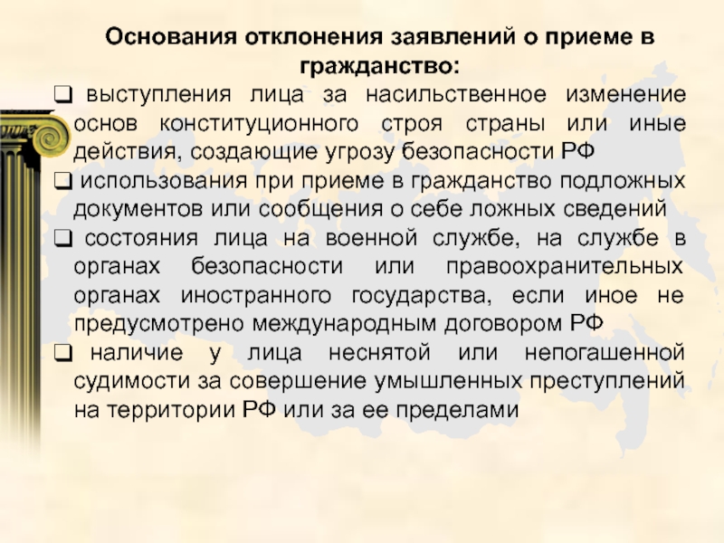 Слайд 25Основания отклонения заявлений о приеме в гражданство: