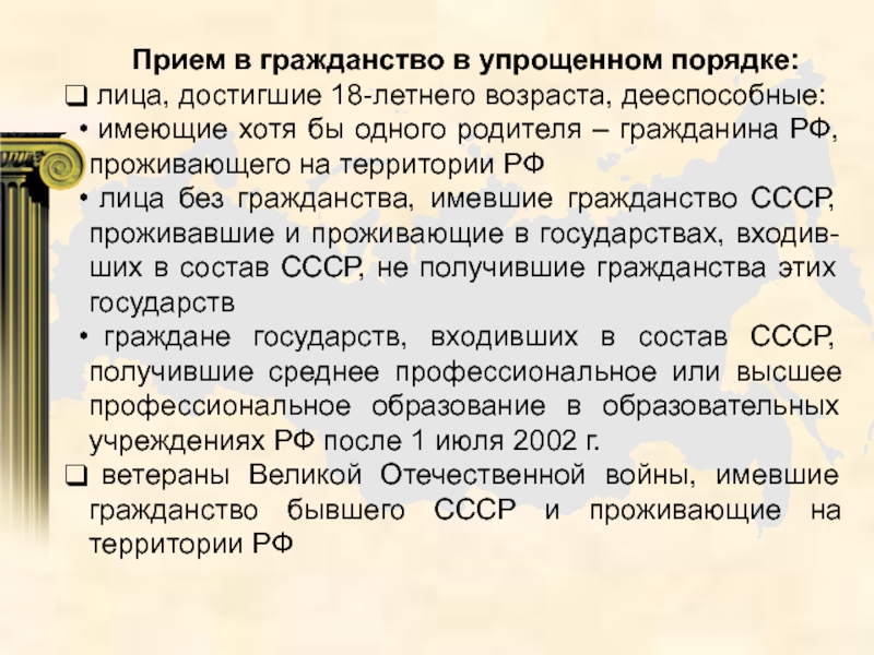 Слайд 23Прием в гражданство в упрощенном порядке: