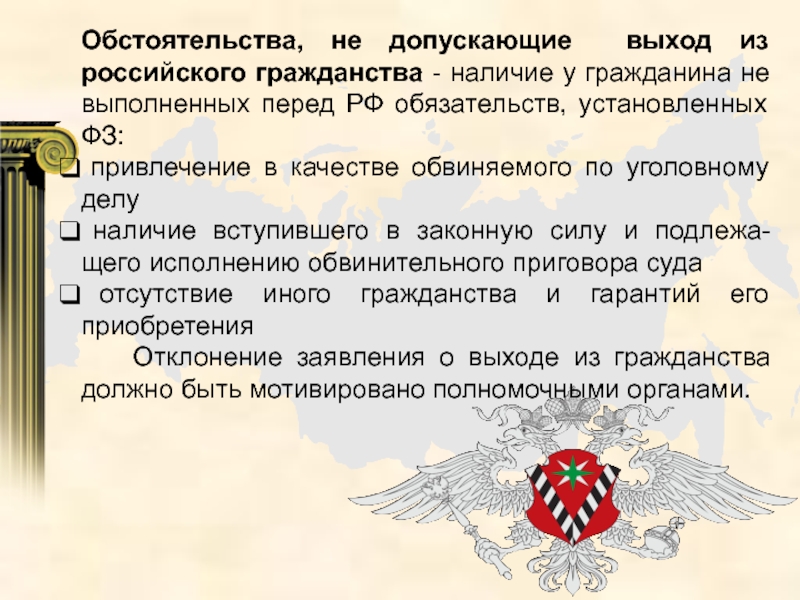 Слайд 36Обстоятельства, не допускающие выход из российского гражданства - наличие у гражданина