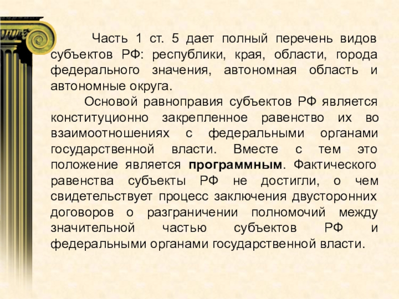Основой равноправия субъектов РФ является конституционно закрепленное равенство их во взаимоотношениях с федеральными органами государственной власти. Вместе с тем это положение является программным. Фактического равенства субъекты РФ не достигли, о чем свидетельствует процесс заключения двусторонних договоров о разграничении полномочий между значительной частью субъектов РФ и федеральными органами государственной власти.