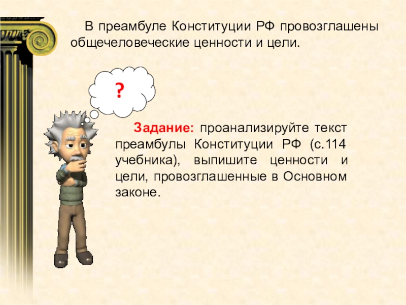 Задание: проанализируйте текст преамбулы Конституции РФ (с.114 учебника), выпишите ценности и цели, провозглашенные в Основном законе.
