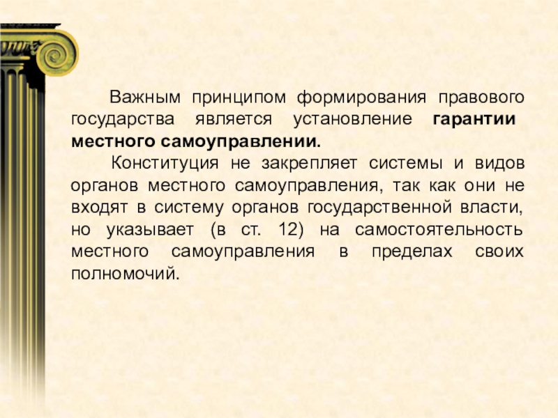 Слайд 27 Важным принципом формирования правового государства является установление гарантии местного