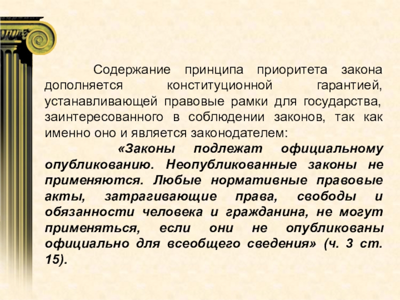«Законы подлежат официальному опубликованию. Неопубликованные законы не применяются. Любые нормативные правовые акты, затрагивающие права, свободы и обязанности человека и гражданина, не могут применяться, если они не опубликованы официально для всеобщего сведения» (ч. 3 ст. 15).