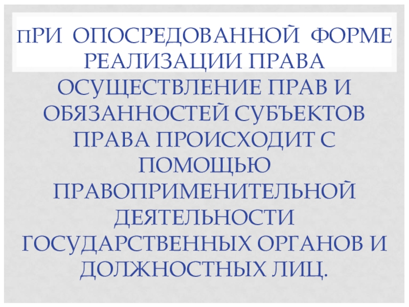 Слайд 6ПРИ ОПОСРЕДОВАННОЙ ФОРМЕ РЕАЛИЗАЦИИ ПРАВА ОСУЩЕСТВЛЕНИЕ ПРАВ И ОБЯЗАННОСТЕЙ СУБЪЕКТОВ ПРАВА