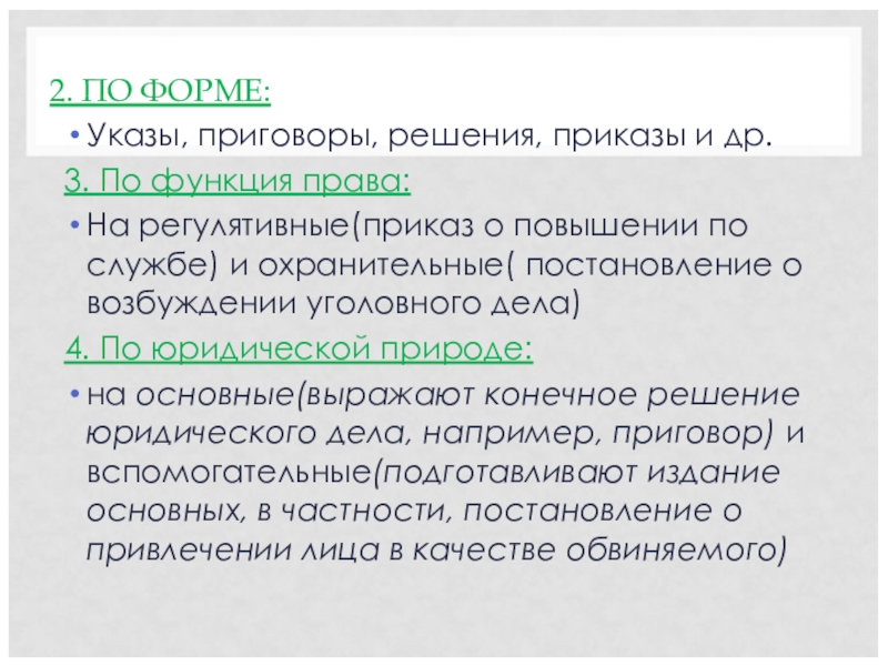 на основные(выражают конечное решение юридического дела, например, приговор) и вспомогательные(подготавливают издание основных, в частности, постановление о привлечении лица в качестве обвиняемого)